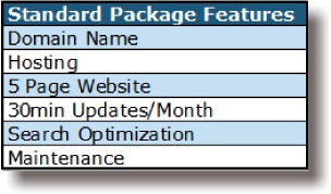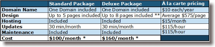 We provide website packages ranging from $100 - $160 these packages are perfect as an initial website for small businesses or organizations and include domain name, custom website design, hosting, updates and maintenance.